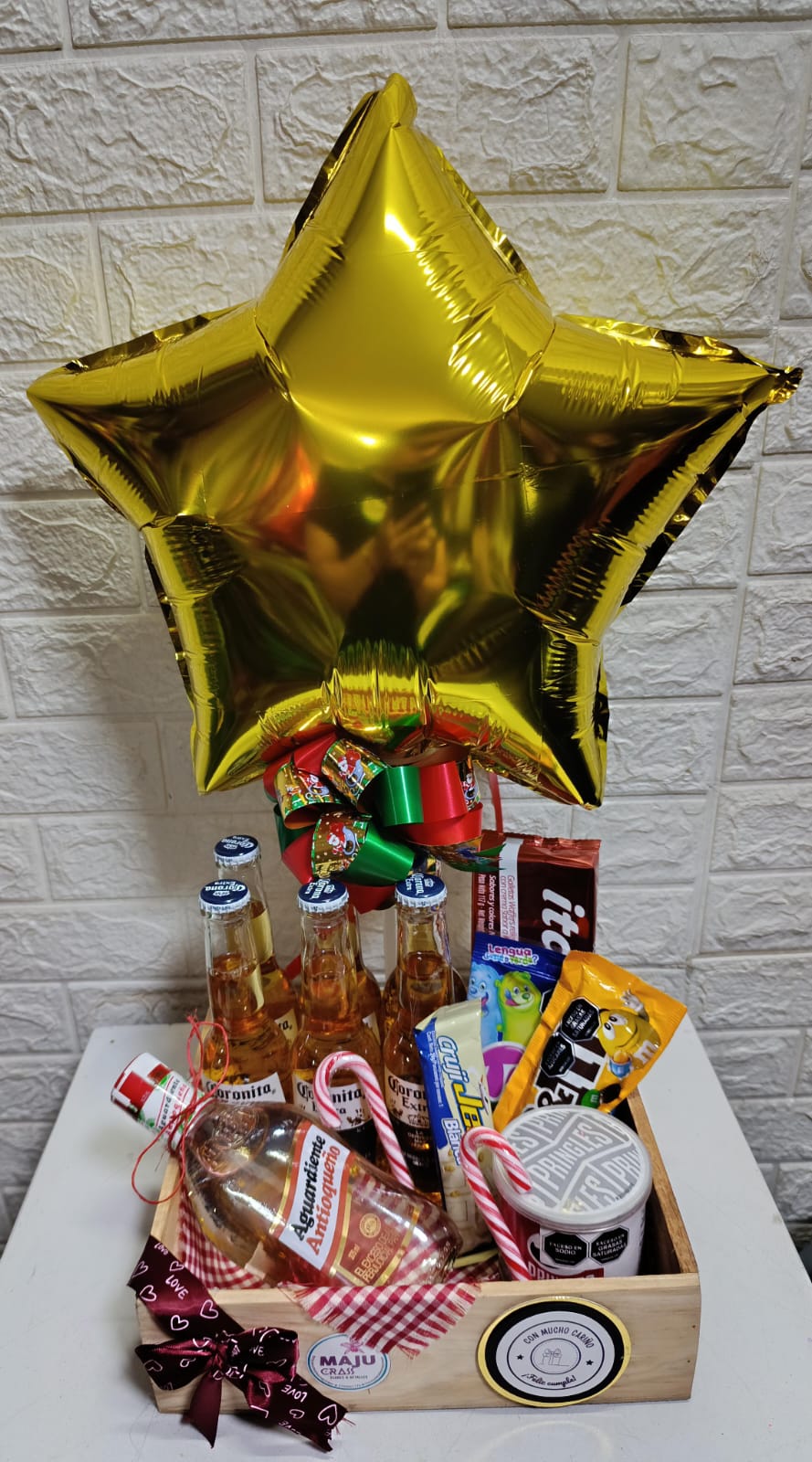 Caja de regalo festiva con globo de estrella dorada, cervezas Corona, aguardiente, y una selección de dulces variados. Ideal para celebraciones y cumpleaños, entregada con un toque de cariño.