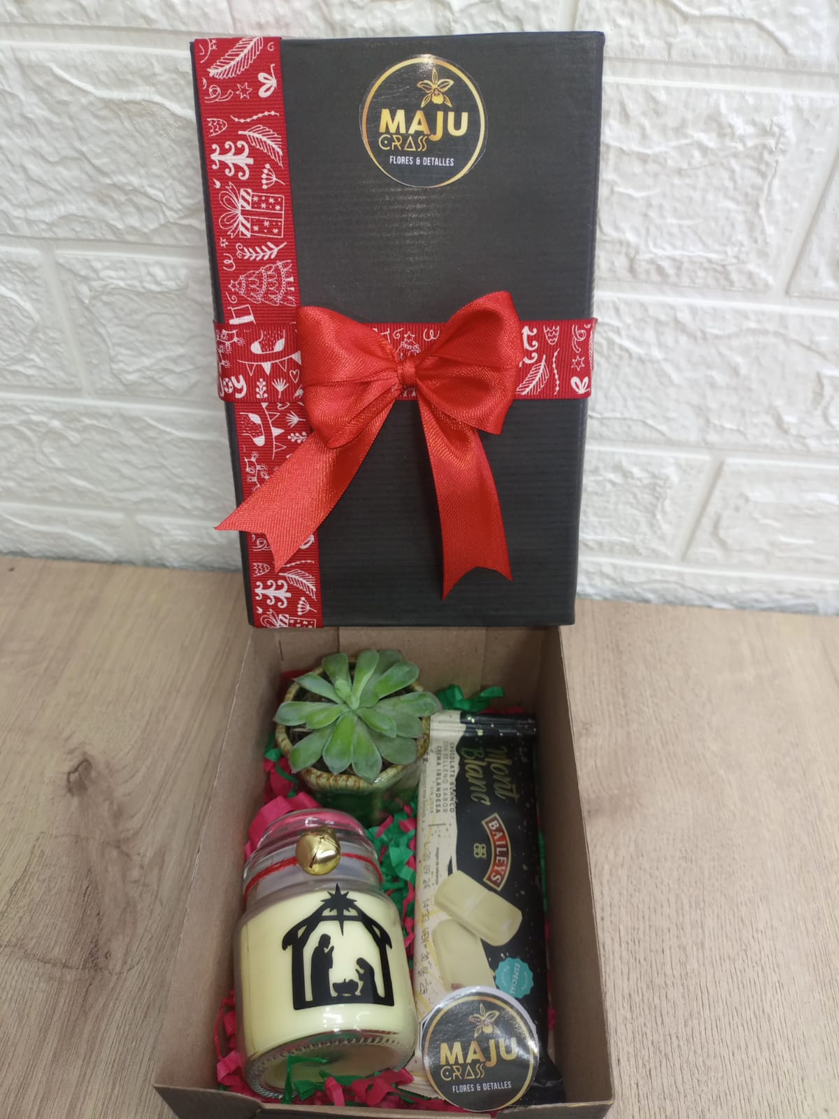 Elegante caja de regalo navideña de Maju Crass, perfecta para sorprender. Incluye una suculenta, vela con diseño de pesebre, chocolate blanco Mont Blanc con Baileys, y decoración festiva.