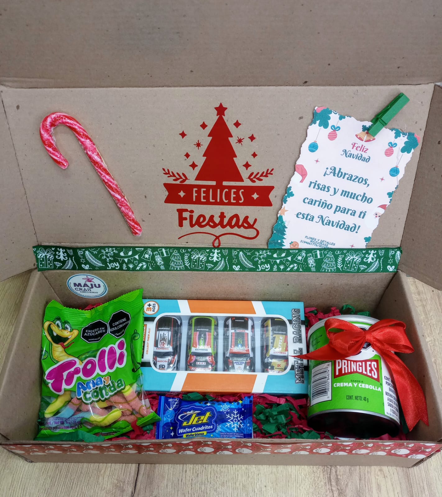 Sorprende a tus seres queridos con esta alegre caja navideña. Incluye dulces, snacks y un set de carros de juguete, ¡perfecta para celebrar la temporada con diversión y sabor!