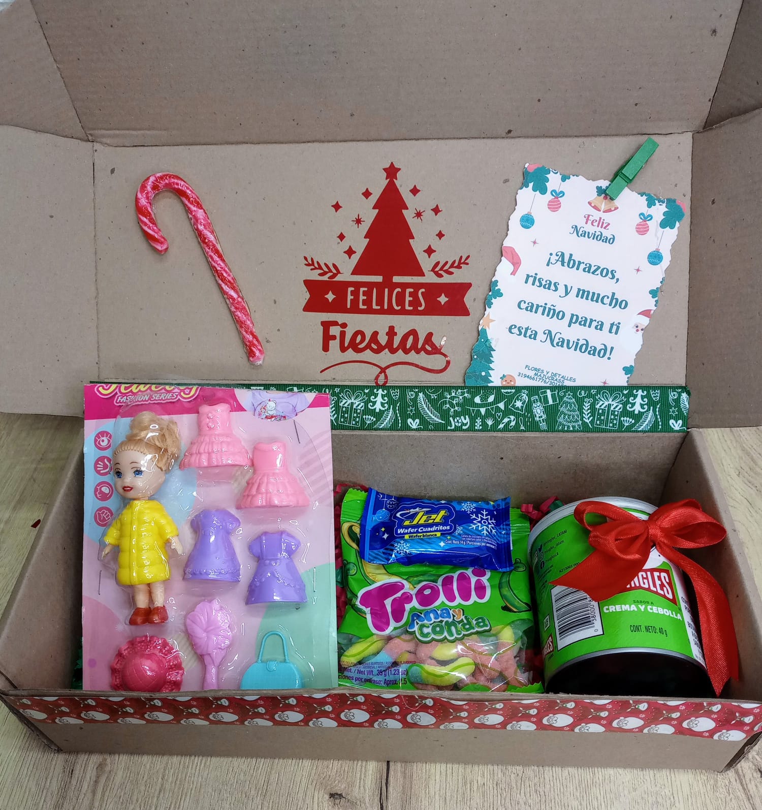 Una encantadora caja de regalo navideña con una muñeca Fashion Series, dulces variados, Pringles y un bastón de caramelo, perfecta para sorprender esta temporada festiva.