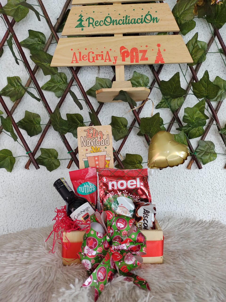 Cesta navideña con vino Gato Negro, snacks, chocolates Noel, galletas, un globo corazón y tarjeta. Presentada en caja de madera decorada con un festivo lazo, ideal para compartir alegría y paz.
