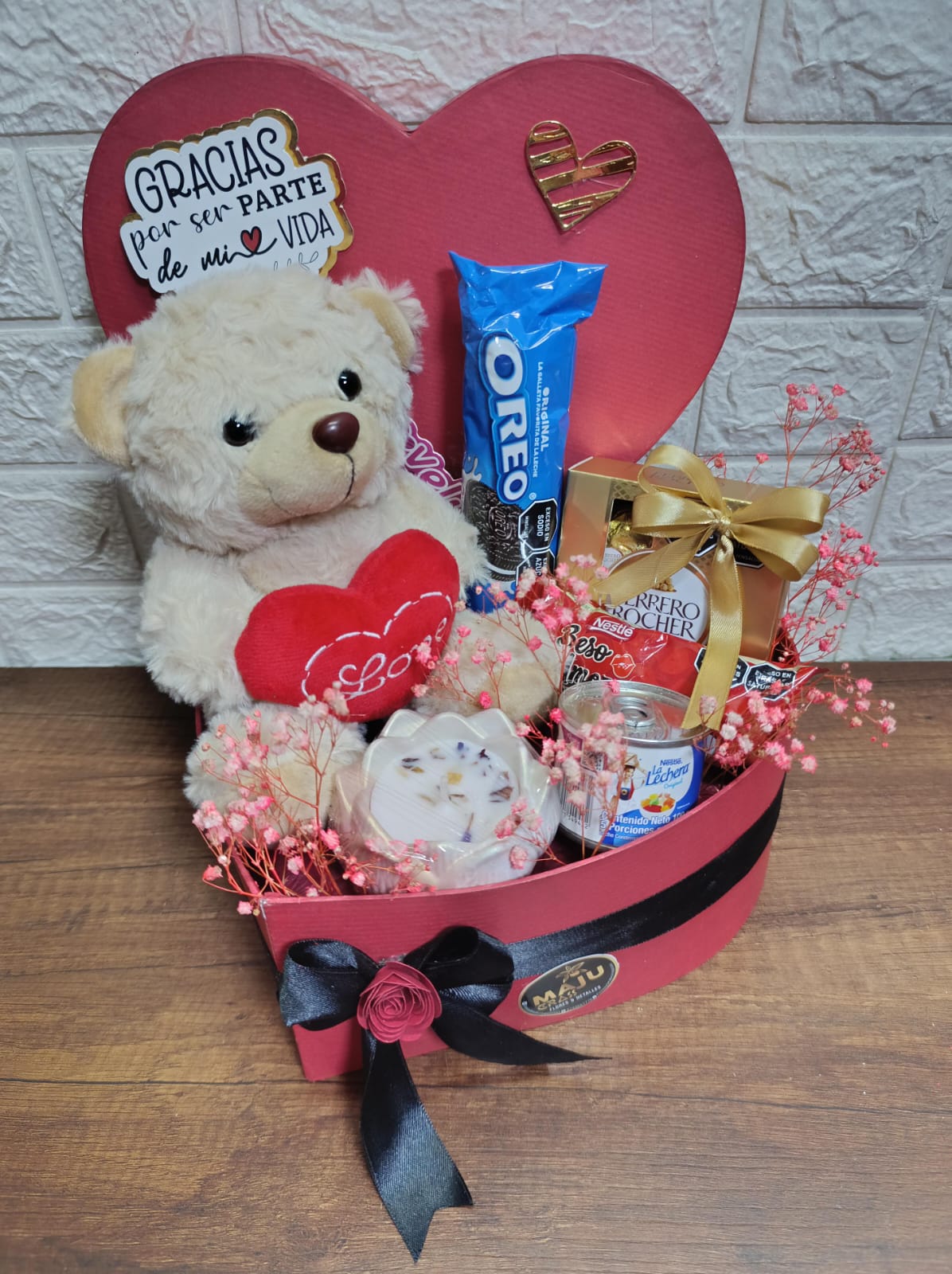 Hermosa caja corazón con suave peluche, chocolates Ferrero, galletas Oreo, dulce beso de amor, tarro de leche condensada, Incluye vela aromatizada en forma de flor de loto romántica, flores decorativas.