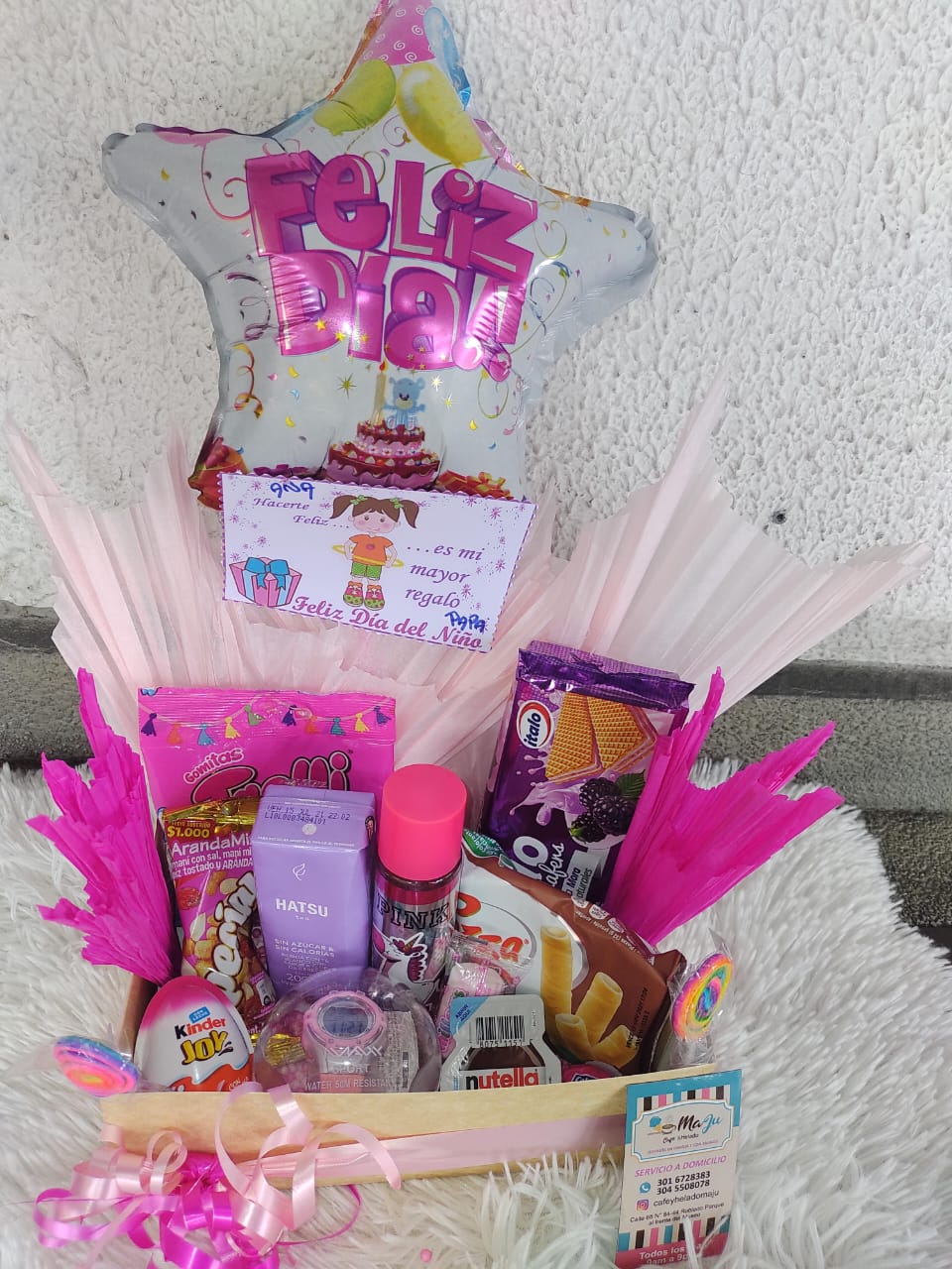 Caja de regalo especial para celebrar el Día del Niño, con una variedad de dulces, snacks, bebida Hatsu, un spray y un reloj digital, decorada con un globo de 'Feliz Día'. Para niño o niña