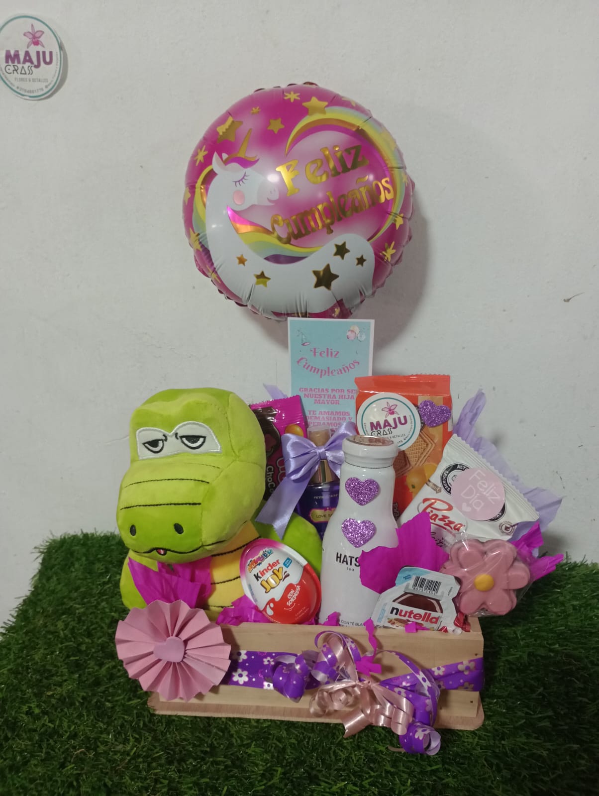 Sorprende con esta encantadora cesta de cumpleaños que incluye un suave peluche, dulces variados como Kinder Joy y Nutella, te hatsu, barquillos, paleta d chocolate en flor, galletas bridge grande, trululu, splash para el cuerpo, especial y un toque de fragancia. Perfecta para celebrar con alegría.
