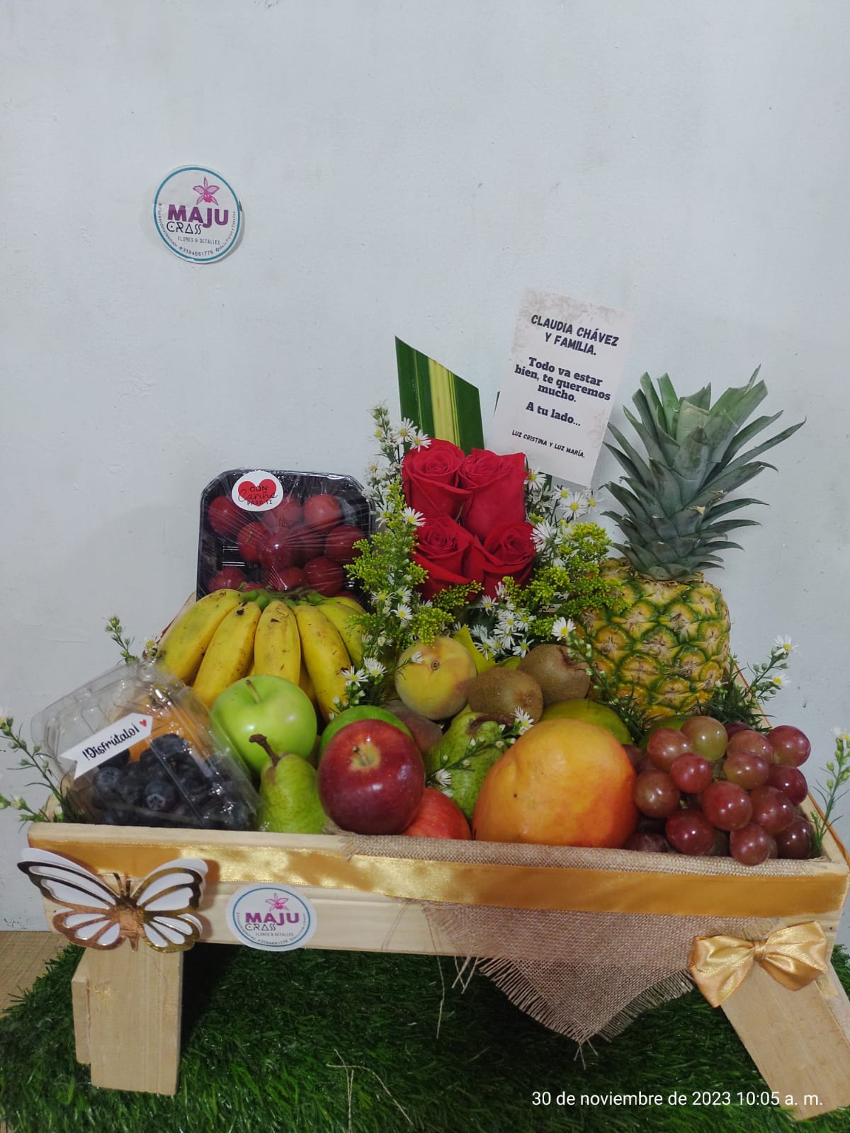 Exquisita cesta con una selección variada de frutas frescas de temporada y un hermoso arreglo de rosas rojas. Perfecta para expresar cariño, buenos deseos o celebrar momentos especiales. Un regalo saludable y elegante.